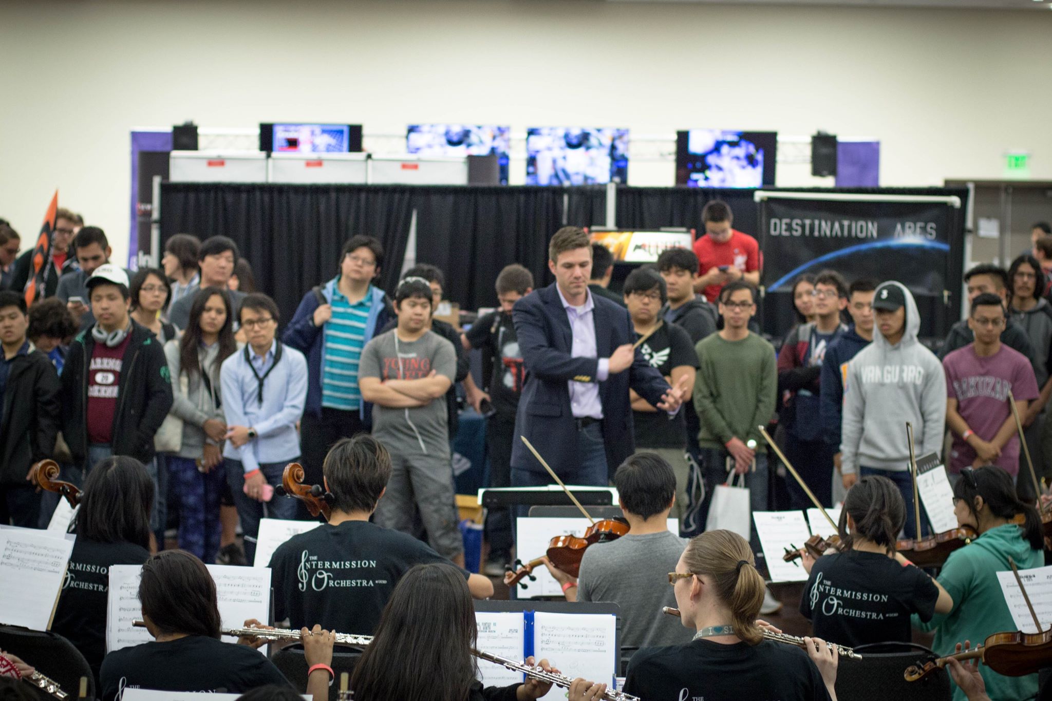 "This photograph is of The Intermission Orchestra at UCSD performing at the Triton Gaming Expo 2017 on May 28, 2017. Our collegiate orchestra is entirely student-run — arranging, conducting, playing, everything. We focus on playing music from video games, films, and Japanese animations. Every quarter, we rehearse weekly for a final concert at the end of the quarter. We also perform at many of Triton Gaming's events, such as the annual Triton Gaming Expo. This year, we have something new — our own t-shirts! I must say, I do believe we look pretty sharp in them. (Hopefully we're playing in tune and not sharp, though.) Definitely looking forward to ordering more shirts for the new academic year after my superb first experience working with CustomInk last quarter. Photo contest notwithstanding, I honestly was floored by the punctuality of the ordering process and the very proactive customer service. I'm already anticipating many more performances to come, with us proudly sporting our shirts!"