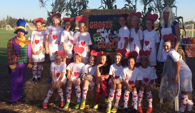 "Granite Bay Ghosts and Goals soccer tournament held Oct 24th-26th. The Granite Bay U12 girls Firestorm dressed as the Ace of hearts and the goal keeper went as their Queen of hearts. Coaches all dressed as other characters from the iconic children story, Alice In Wonderland. Though we didn't win the tournament costume contest, our girls had a blast playing in their Custom Ink uniforms. What a pleasure it was talking to all the Custom Ink customer service people. Every time I called in, they new my name, they were polite and helpful and helped me get the best deal possible for our team. The girls loved their uniform costumes and we're already planning next years design!"
