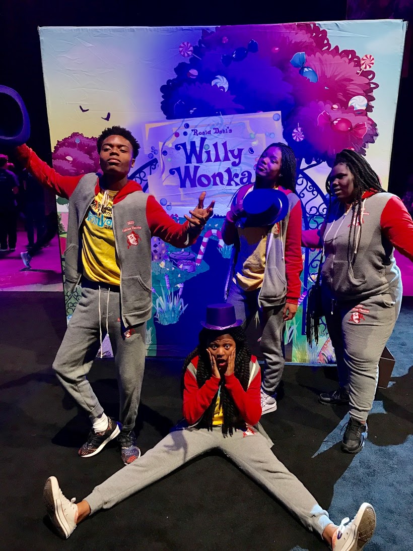 "In this photo members of the SEED Falcon Theatre pose in their customink.com apparel at the annual Junior Theater Festival in Atlanta. They pose in front of the banner announcing the release of the Willy Wonka, Jr. script.