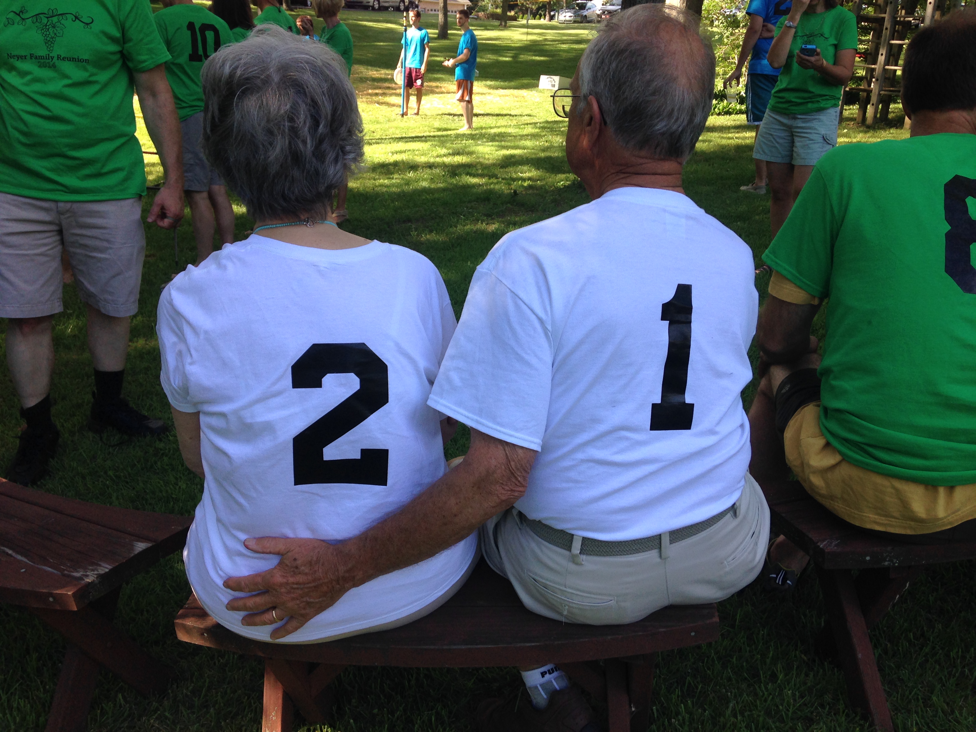 "This is a picture of my parents, #1 & #2, who started our great family (now numbering 72!) - and for our family reunion, we put #'s on the back of each person's shirt, signifying their entry into the family within each generation (children of #1&2, are in green tshirts numbering 1-17, grandchildren in blue numbering 1-45, great grandchildren in teal numbering 1-8, including 2 not yet born!). (see previous submitted photo of the entire group)