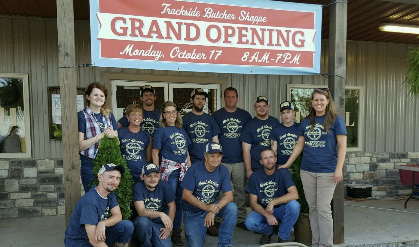 "This is the Trackside Butcher Shoppe team! Monday, October 17th we hosted the grand opening of our butcher shoppe in Campbellsburg, KY where over 300 people joined us. We hosted the Kentucky Commissioner of Agriculture, state senators, county dignitaries, and the regions best local meat producers. Guests were welcomed by the team, who were all wearing the amazing shirts CustomInk helped us design. And many guests walked away with their own! Designing and ordering our CustomInk t-shirts were honestly the easiest part of planning the grand opening. We recommend CustomInk to anyone looking to promote their business or event!"