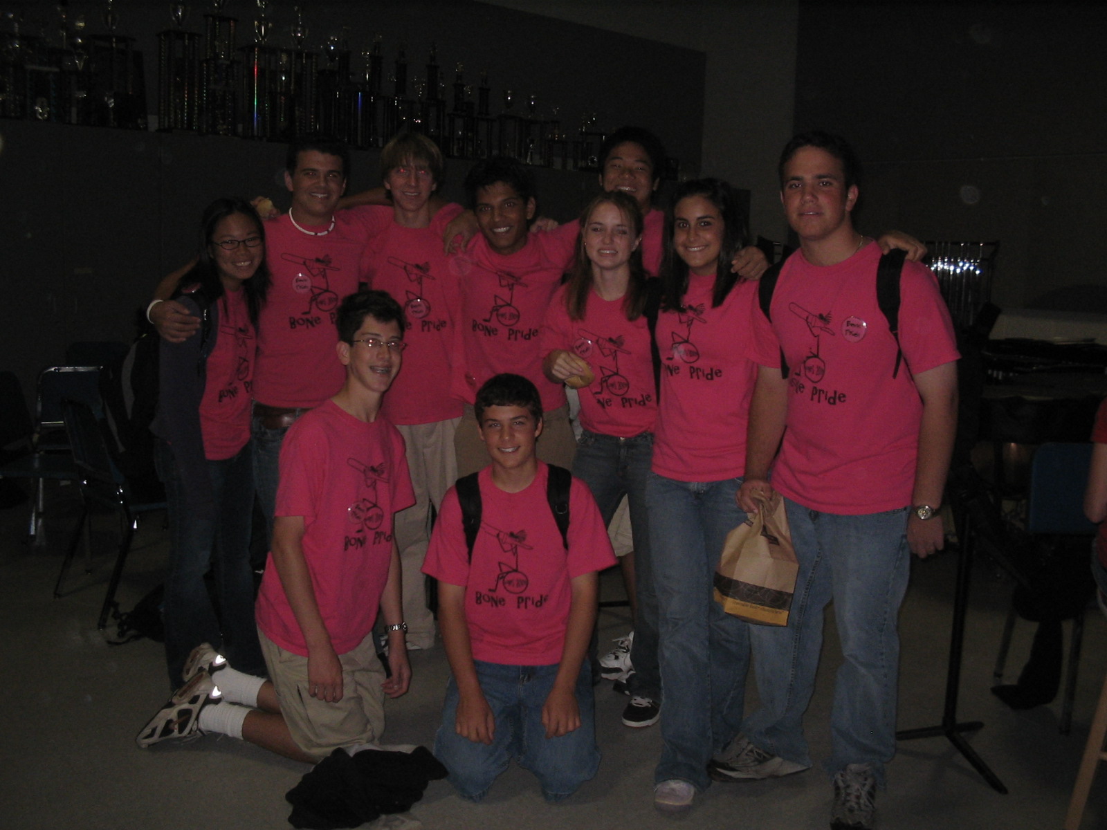 "This is the Troy High trombone section of 2005-2006. During this year all eleven of us became an extremely close group. This marked the first usage of the term "bone pride" which simply means pride of being in the trombone section. This photo was taken the morning of our big competition where we all wore our "bone pride" shirts to school."