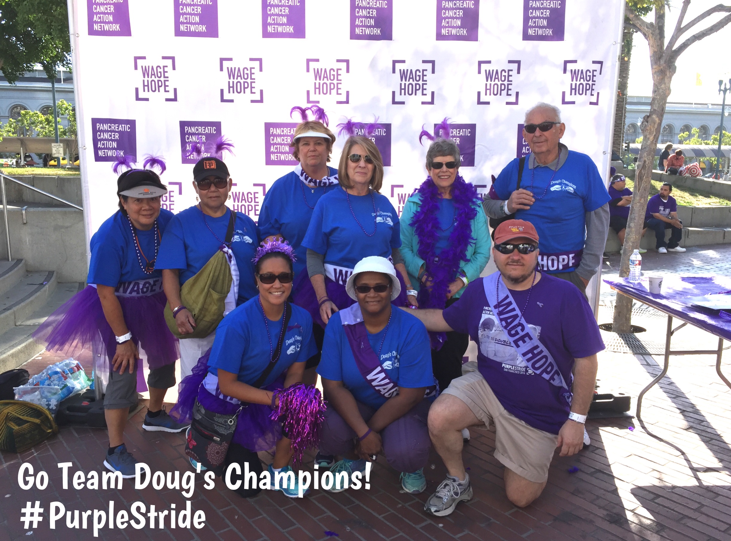 "On Saturday, June 11, 2016, we walked 3 miles in support of Pancreatic Cancer research. Our dear friend, Doug, passed away in March after losing his fight against this aggressive disease. We were also walking for two others who had passed away (a wife and a father). It was a beautiful day in San Francisco, CA on Saturday -- we knew they were with us in spirit. We raised over $6,000 for the cause and we look forward to walking again next year. #PurpleStride"