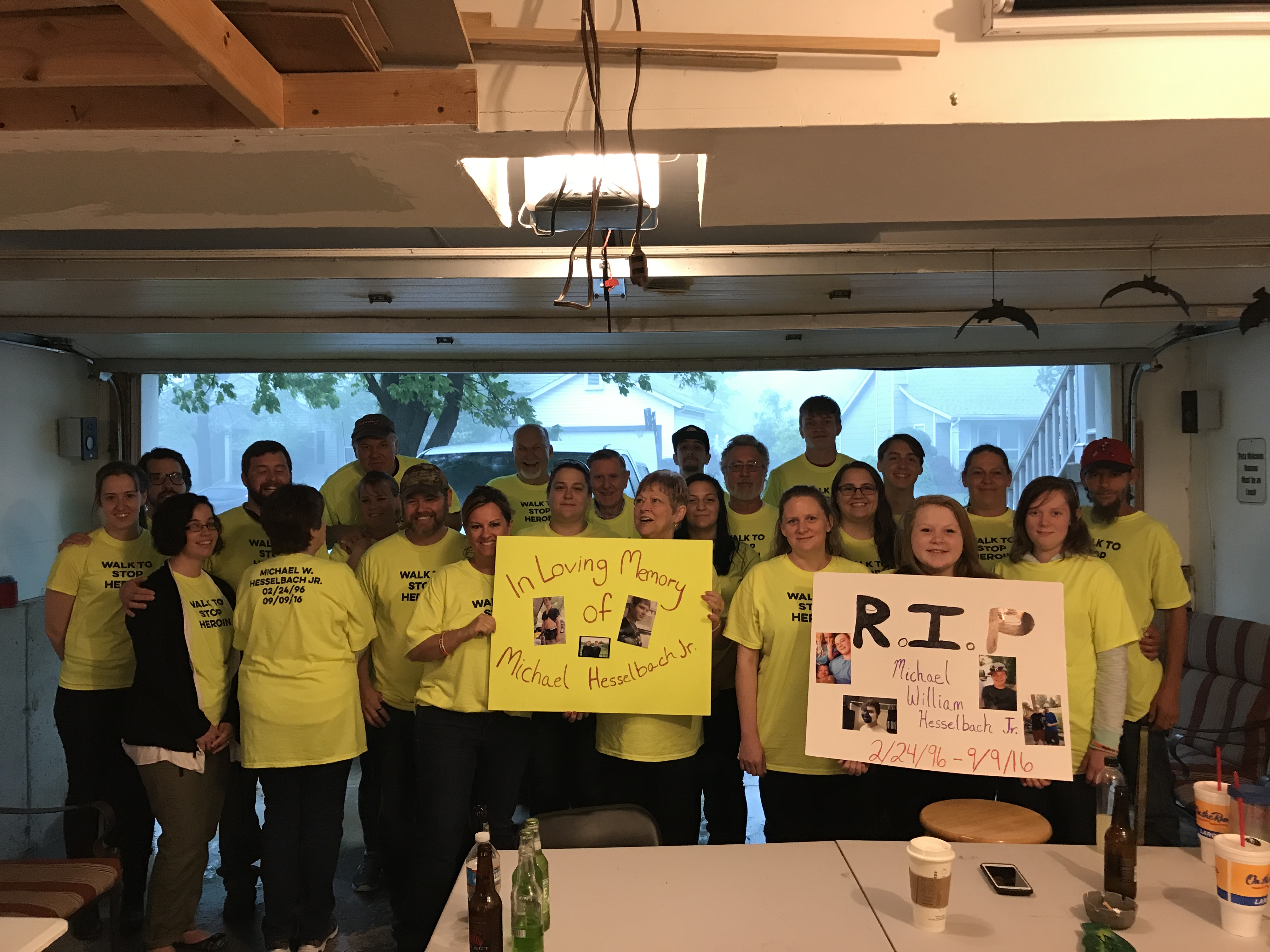 "This photo is to honor our son Michael W. Hesselbach who overdosed on heroin. We were suppose to walk with about 1800 other people to spread awareness of this awful drug and how it is killing our loved ones. The walk was cancelled due to rain and thunderstorms but the weather did not keep our family and friends from gettIng together for a very we BBQ. Which will explain why the photo was taken in the garage...it was poring!!! Thank you all for the wonderful shirts. I feel it brought my family and friends closer together."