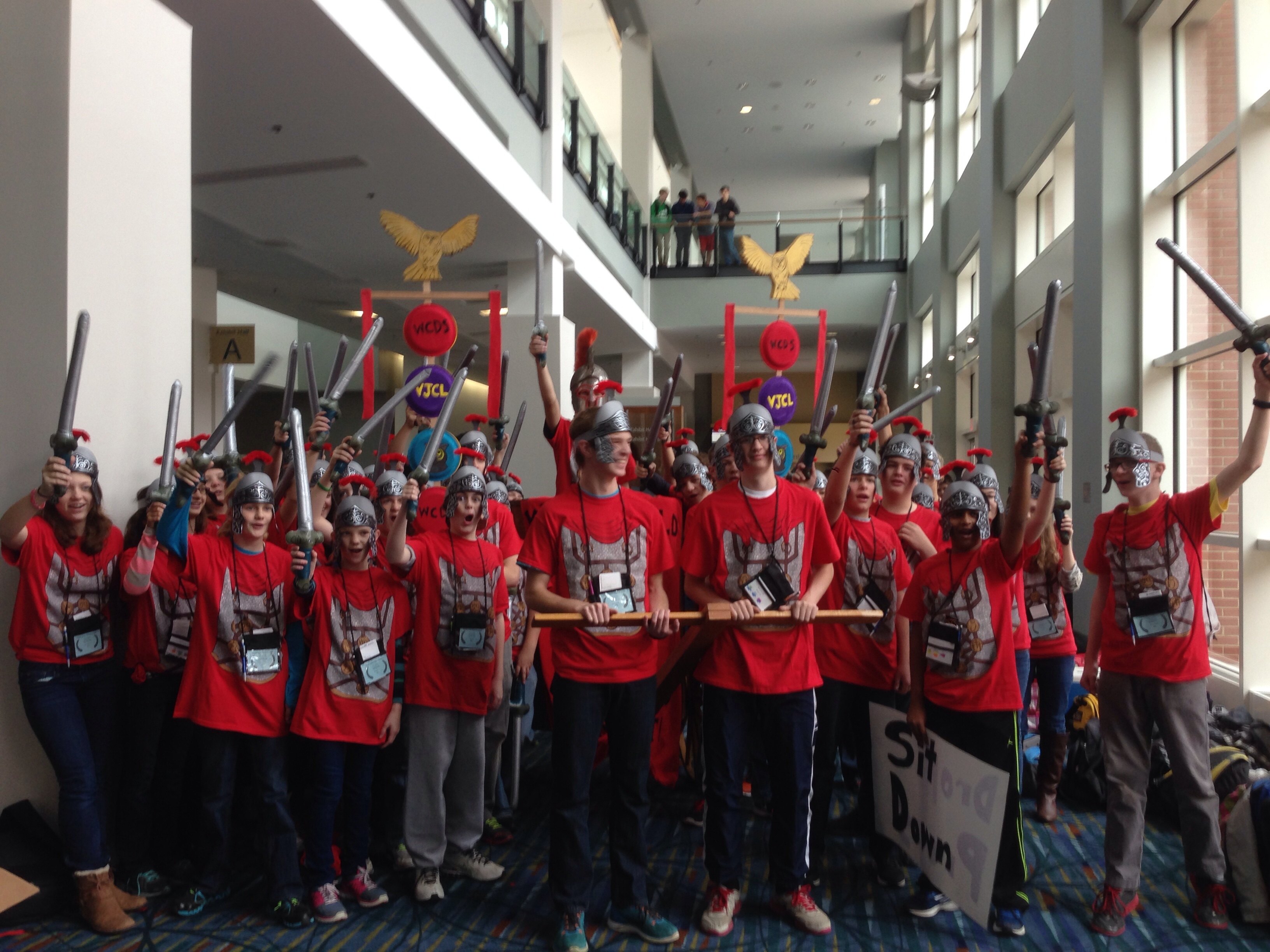 "Our delegation of students designed and wore these t shirts to a Latin convention as part of a spirit contest. The shirts reflected the convention theme very cleverly and won 2nd in the school t-shirt contest. They show a Roman breastplate on the front. We wore the shirt in conjunction with roman helmets and swords to complete our soldierly look. In the picture you can see our group together with our full sized chariot and battle standards. Custom ink was great to work with. You delivered a high quality product very speedily and your artist reviewers caught a spelling error that would have been really unfortunate. "