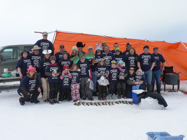 "This is a picture of our Family's annual ice fishing derby. This is the 2nd time we have ordered shirts from custom ink. Many wore their old shirt from Feb 2007 this time to the derby and they still look great. Love the quality of the shirts and custom ink even phoned to let me know that UPS had a weather delay on our shirts...but they still arrived before 2 weeks and in time for our Derby. Can't wait to start designing our shirts for the next Derby! Must have been lucky shirts as we caught lots of fish!!"